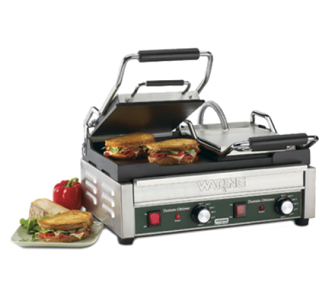 Tostato Ottimo™ Dual Toasting Grill, electric, double, 17" x 9-1/4" cooking surface, hinged auto-balancing top plate with heat resistant handles, flat cast iron plates, adjustable thermostats 570°F (300°C), indicator lights, brushed stainless steel body & removable drip tray, 3.2kW, 240v/60/1-ph, 13.3 amp, NEMA 6-20P, UL, NSF