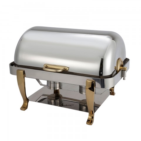 Vintage Chafer, 8 qt., full size, rectangular, 18/10 stainless steel frame, solid brass gold-plated handles and legs, roll top, includes food pan, water pan, and fuel holders, mirror finish (Qty Break = 1 each)