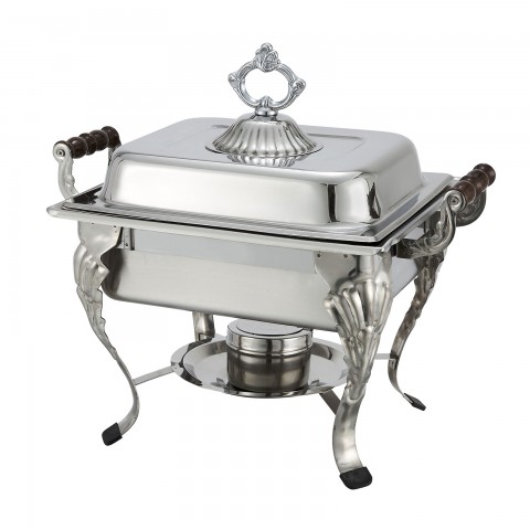 Crown Chafer, 4 qt., half size, square, with dome cover, wooden handles, stainless steel, includes food pan, water pan, and fuel holder, mirror finish (Qty Break = 1 each)