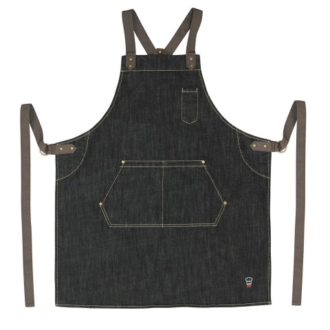 Downtown Bib Apron, 31-3/4”L x 26-3/4”W, with (2) regular pockets and (1) pen pocket, machine wash and dry, 80/20 cotton/poly blend, Signature Chef, dark wash denim with brown straps (Qty Break = 12 each)