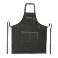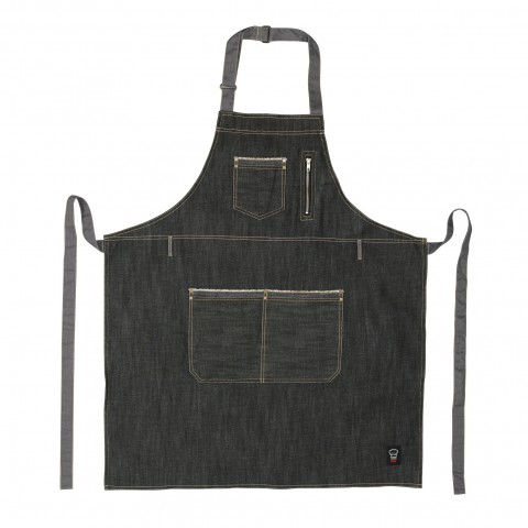 Village Bib Apron, 34-1/2”L x 30-1/4”W, with (3) pockets and (1) zipper pouch, adjustable neck straps, machine wash and dry, 80/20 cotton/poly blend, Signature Chef, dark wash denim with gray straps (Qty Break = 12 each)