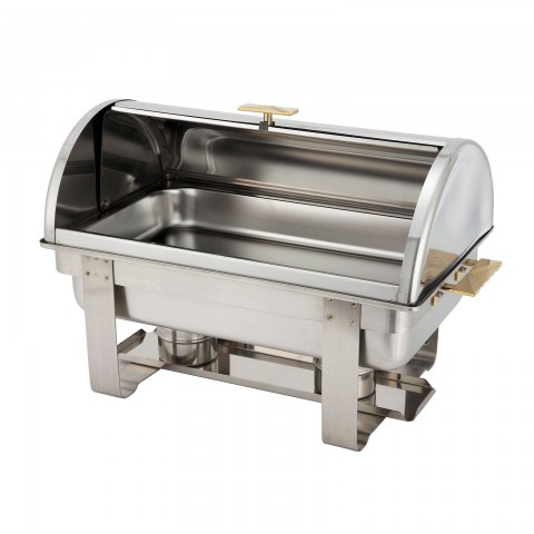 Dallas Chafer, 8 qt., full size, rectangular, roll top, stainless steel with gold accents, includes food pan, water pan, and fuel holders, mirror finish (Qty Break = 1 each)