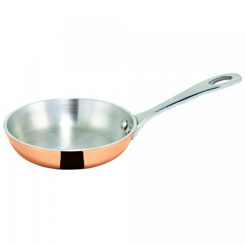 Mini Fry Pan, 5 oz., 4" dia., round, with riveted handle, induction ready, tri-ply heavy duty bottom with aluminum core, 18/8 stainless steel, copper plated (Qty Break = 6 each)