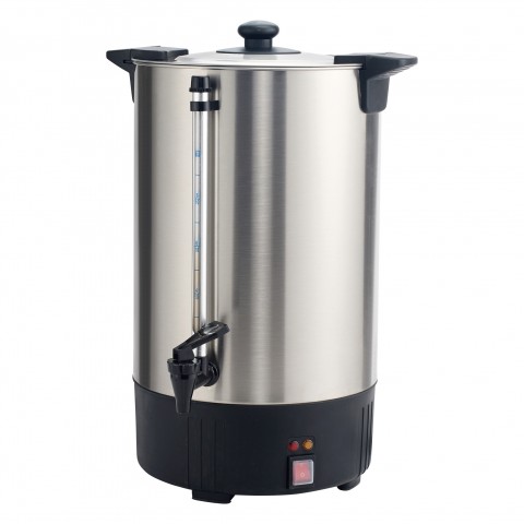 Commercial Coffee Urn, 100-Cup (16 liter), twist-locking lid, cool touch handles, dripless faucet with protected level indicator, waterproof ON/OFF switch with protective cover, stainless steel percolator pipe and plastic filter baskets, automatic shut-off safety feature, 304 stainless steel, 1.5kW, 110-120v/60/1-ph, NEMA 5-15P, CE, cETLus (Qty Break = 2 each)