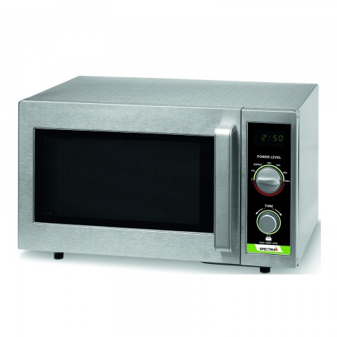 Spectrum™ Commercial Microwave, .9 cubic feet capacity, 1450 W input power, dial control, accommodates 12" dia. platter, bottom energy feed system with ceramic plate, backlit LED display, interior oven light, customizable cooking timer up 60 minutes, stainless steel, 120v/60/1-ph, 12 amp, 1000 watts, NEMA-5-15P, cULus (Qty Break = 1 each)