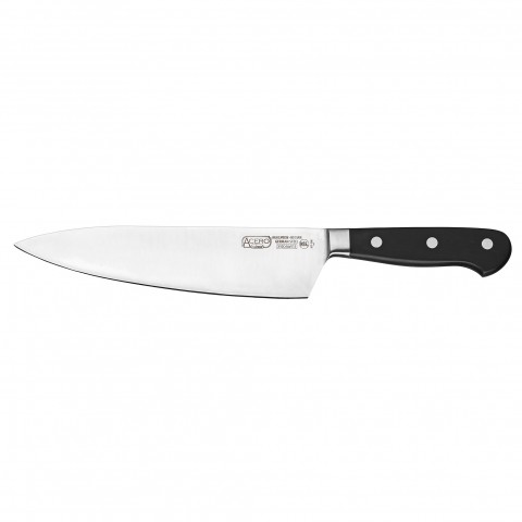 Acero Chef Knife, 8" blade, short bolster, triple riveted, one piece, full tang, forged, German high carbon stainless steel, injection molded POM handle, black, NSF (Qty Break = 6 each)