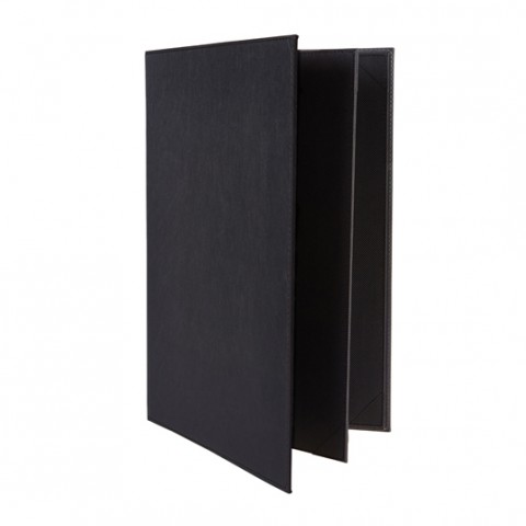 Menu Cover, four views, legal size, holds 8-1/2" x 14" paper, leather-like, interior picture corners or top/bottom magnets, black (Qty Break = 10 each)
