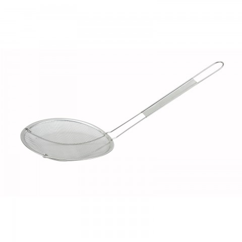Strainer, 6" bowl dia., 9-1/2"L handle, 14" O.A.L., round, single coarse mesh, stainless steel (Qty Break = 12 each)