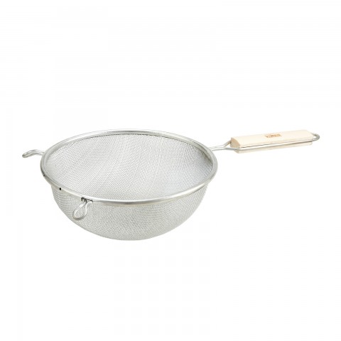 Strainer, 8" bowl dia., 6-1/2"L handle, 14-1/4" O.A.L., round, single tinned mesh, medium, wood handle (Qty Break = 12 each)