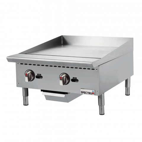 Spectrum™ Griddle, natural gas, countertop, 24"W x 20-3/4" cooking surface, (2) 30,000 BTU burners, infinite heat controls, standing pilot light, 3/4" polished steel plate, side and back splash guard, stainless steel insulated double-wall body and cool-touch front plate rail, 3-1/2" full width grease trough, grease drawer with weep hole and baffle, 3/4" rear gas connection with regulator, LP conversion kit, adjustable legs, non-skid feet, 60,000 BTU, CSA-Sanitation, CSA Flame, CSA Star (Qty Break = 1 each)