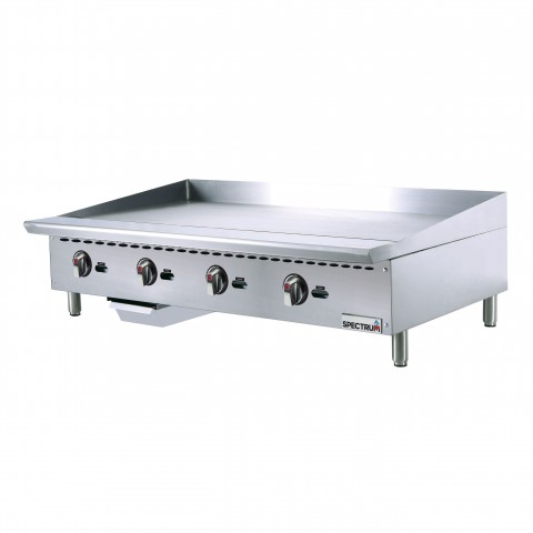 Spectrum™ Griddle, gas, countertop, cooking surface: 48" x 20-3/4" cooking surface, (4) 30,000 BTU burners, infinite heat controls, standing pilot light, 3/4" polished steel plate, side and back splash guard, stainless steel insulated double-wall body and cool-touch front plate rail, 3-1/2" full width grease trough, grease drawer with weep hole and baffle, 3/4" rear gas connection with regulator, LP conversion kit, adjustable legs, non-skid feet, 120,000 BTU, CSA-Sanitation, CSA Flame, CSA Star (Qty Break = 1 each)