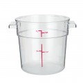 Food Storage Container, 1 qt., 5-1/8" x 6-3/8" x 4-7/8"H, round, stackable, temperature range: -40°F to 210°F, built-in handles, graduation markings in quarts & liters, dishwasher safe, polycarbonate, clear, NSF (Qty Break = 12 each)