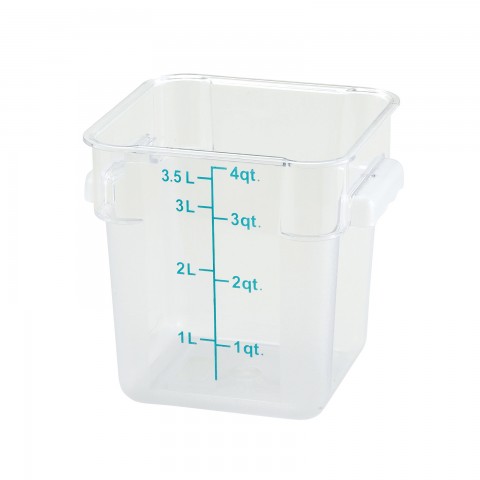 Storage Container, 4 qt., 7-1/8" x 8-5/8" x 7-1/4"H, square, stackable, built-in handles, graduation markings in quarts & liters, temperature range: -40°F to 210°F, dishwasher safe, polycarbonate, clear, NSF (Qty Break = 12 each)