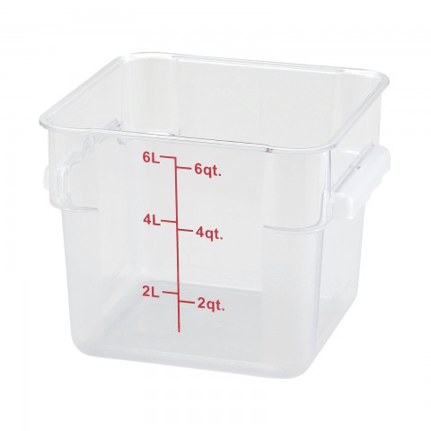 Storage Container, 6 qt., 8-3/4" x 10-1/4" x 7-1/4"H, square, stackable, built-in handles, graduation markings in quarts & liters, temperature range: -40°F to 210°F, dishwasher safe, polycarbonate, clear, NSF (Qty Break = 12 each)