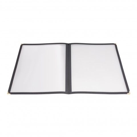 Menu Cover, double fold, overall 9-3/8" x 12-1/8", holds 8-1/2" x 11" paper, black, double stitched edging, plastic (Qty Break = 25 each)