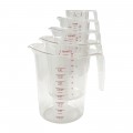 Measuring Cup, 5-piece set, includes: 1 cup, 1 pint, 1, 2 & 4 qt., raised external markings in quarts (red letters) and liters (blue letters), one-piece, tapered open handle, stackable, secure grip, heat resistant up to 210°F (98°C), dishwasher safe, polycarbonate, NSF (Qty Break = 6 set)