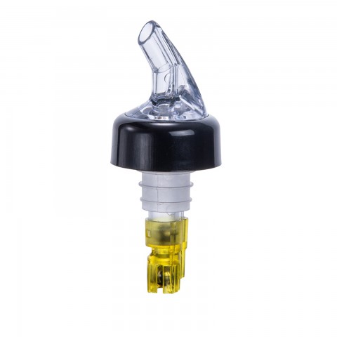 Measuring Pourer, 1-1/2 oz., with black collar, clear spout, plastic with stainless steel ball bearings inside, yellow tail (Qty Break = 10 dozen)