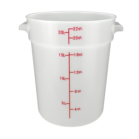 Storage Container, 22 qt., 12.31" x 14.25" x 14.75"H, round, temperature range: -40°F to 160°F, with built-in handles, graduation markings in quarts & liters, stain resistant, dishwasher safe, BPA free, polypropylene, white, NSF (Qty Break = 6 each)