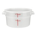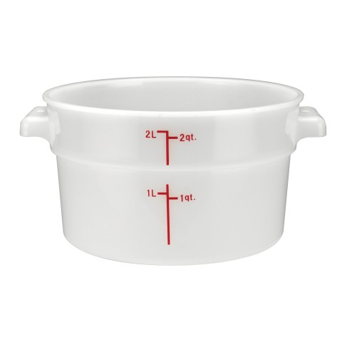 Storage Container, 2 qt., 7.31" x 8.63" x 4.25"H, round, temperature range: -40°F to 160°F, with built-in handles, graduation markings in quarts & liters, stain resistant, dishwasher safe, BPA free, polypropylene, white, NSF (Qty Break = 12 each)