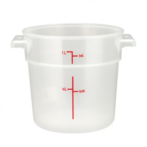 Storage Container, 1 qt., 5.13" x 6.13" x 4.88"H, round, temperature range: -40°F to 160°F, with built-in handles, graduation markings in quarts & liters, stain resistant, dishwasher safe, BPA free, polypropylene, translucent, NSF (Qty Break = 12 each)