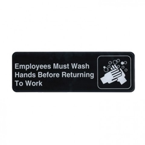 Information Sign, with symbol, 9" x 3"H, "Employees Must Wash Hands Before Returning To Work", white imprint on black (Qty Break = 12 each)