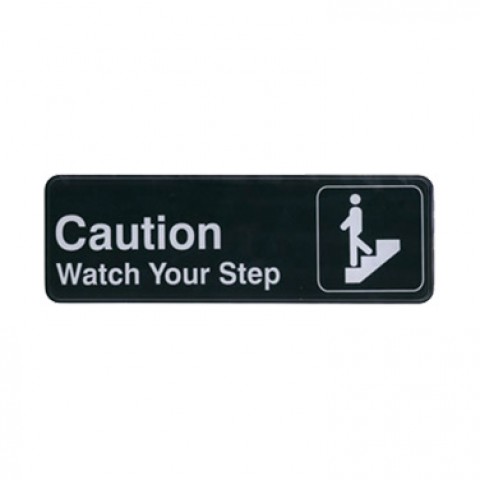 Information Sign, with symbol, 9" x 3"H, "Caution/Watch Your Step", white imprint on black (Qty Break = 12 each)