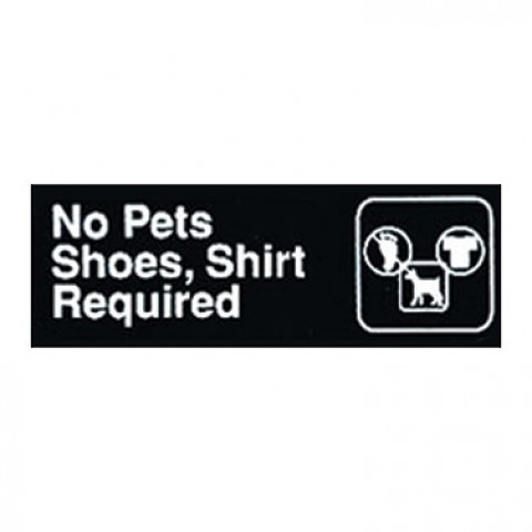 Sign, 9" x 3"H, "No Pets/Shoes Shirt Required", white imprint on black (Qty Break = 12 each)