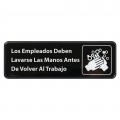 Information Sign, with symbol, 9" x 3"H, "Employees Must Wash Hands Before Returning To Work" in Spanish, white imprint on black, plastic with adhesive back (Qty Break = 12 each)
