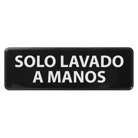 Information Sign, 9" x 3"H, "Hand Wash Only" in Spanish, white imprint on black, plastic with adhesive back (Qty Break = 12 each)