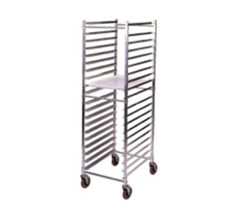 Mobile Pan Rack, full height, 21"W x 26"D x 69"H, end loading, open sides, (20) 18" x 26" pans capacity, 3" OC spacing, all welded angle pan supports, aluminum construction, 5" polyolefin swivel stem casters, NSF, shipped KD