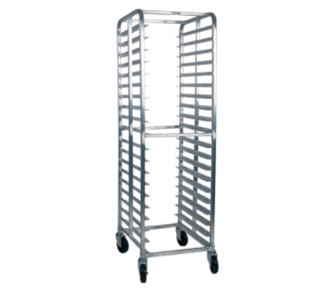Pan Rack, mobile, (20) 18" x 26" sheet pans capacity, 3" spacing, 800 lb. rolling capacity, end load, aluminum construction, 5" casters, NSF