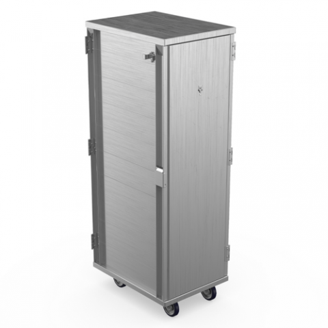 Pass Through Enclosed Transport Cabinet, 21"W x 27.5"D x 66-1/4"H, reinforced aluminum construction, non-insulated, accommodates (39) 18" x 26" pans, double pan construction with reinforced braces, 1-1/2" runner spacing, solid hinged door, 5" swivel plate casters with polyurethane tread, NSF