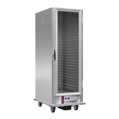 Insulated Universal Runner Heater/Proofer Cabinet, mobile, full height, 24″W x 32″D x 70″H, aluminum construction, forced air, removable chrome wire pan slides can be adjusted on 2″ increments, accommodates (28) 18″ x 26″ pans, dual proof/heat control, field reversible clear door with magnetic door latch, removable digital drawer, digital control, circuit breaker, LED digital thermometer display, corner bumpers, (4) casters, 120v/60/1-ph, NEMA 5-15P, cETLus, NSF