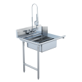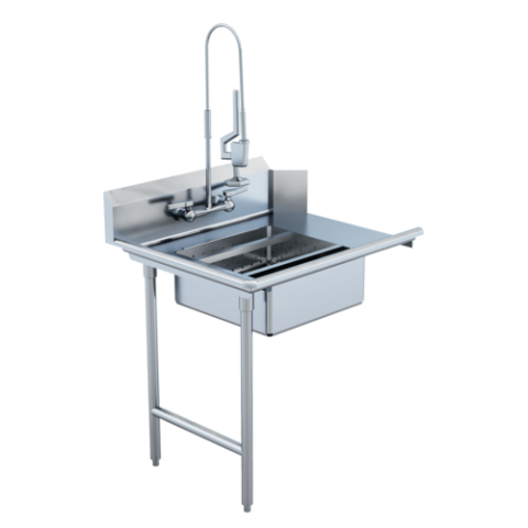 Straight Soiled Dish Table, left to right, stainless steel legs and clad bullet feet, fabricated bowls have 14" deep water level, faucets and parts sold separately, 14 gauge 300 series stainless steel, 60"L x 30"W, NSF (contact factory for price)