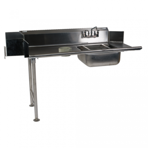 Straight Soiled Dish Table, left to right, stainless steel legs and clad bullet feet, fabricated bowls have 12" deep water level, faucets and parts sold separately, 16 gauge 300 series stainless steel, 84"L x 30"W, NSF (contact factory for price)