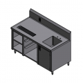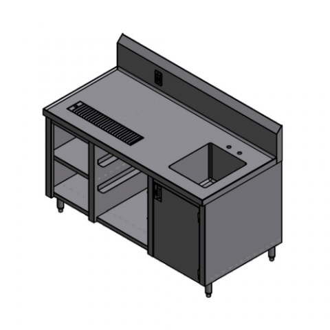 Beverage Counter, 60"W x 30"D x 34"H, 14/304 stainless steel top with marine edge across front & sides, 10" backsplash with 2" return, 36" urn trough, right side built-in sink 14" x 16" x 12", GFI duplex outlet mounted in backsplash, open design base with (2) shelves, (4) legs, (3) glass rack slides for 20" x " racks, 8" on centers. NSF.
