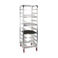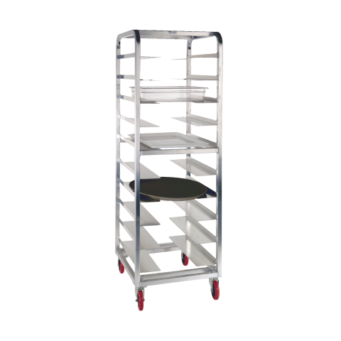 Universal Pan Rack, holds 18" x 26" sheet pans, 27"W x 26D" x 70", all welded aluminum construction, 6" runner spacing, (10) pan capacity, four 5" polyurethane swivel stem casters, NSF