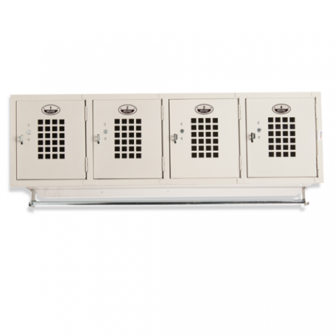 Lockers, wall mounted, 48″W x 18″D x 13-5/8″H (overall), (4) total lockers, doors are mesh grid, beige finish, includes: garment storage bar, fully assembled