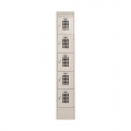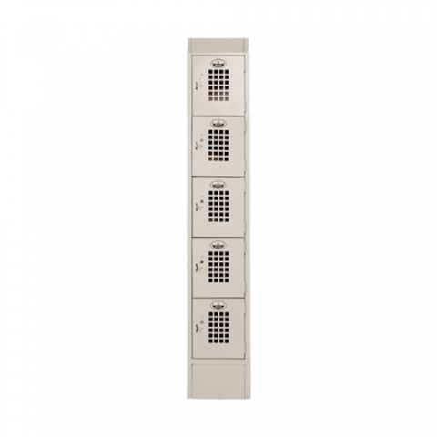 Locker, 1 column, 5 lockers, 12"D x 12"L x 71.9"H OA, slanted top, doors are mesh grid vented, beige