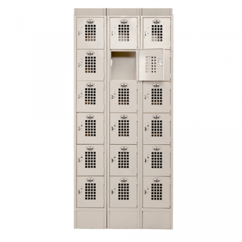Lockers, 6-tier, floor mounted, slant top, 36″W x 18″D x 78″H (overall), (3) columns, (18) total lockers, 10″W x 18″D x 12″H (compartments size), doors are mesh grid vented, beige finish, fully assembled