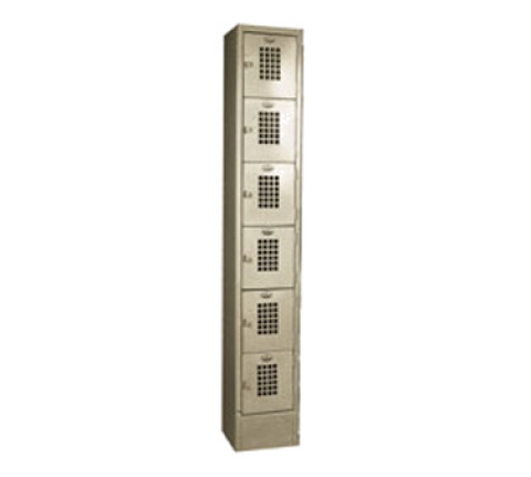 Lockers, 6-tier, floor mounted, 12"W x 12"D x 78"H (overall), (1) columns, (6) total lockers, 10"W x 12"D x 12"H (compartments size), doors are mesh grid vented, beige finish, fully assembled