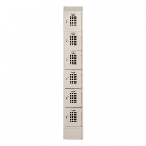 Locker, 1 column, 6 lockers, 12"D x 12"L x 83.9"H OA, slanted top, doors are mesh grid vented, beige