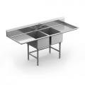Sink, two compartment, with right & left hand 18" drainboards, 20" front-to-back x 20" wide x 14" deep with backsplash, stainless steel legs & adjustable feet, 14 gauge stainless steel, NSF (contact factory for price)