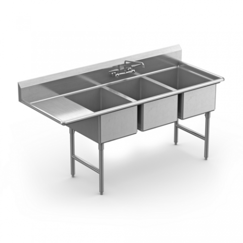 Sink, three compartment, with left-hand 24" drainboard, 28" front-to-back x 20" wide x 12" deep with backsplash, stainless steel legs & adjustable feet, 16/304 stainless steel, NSF (contact factory for price)