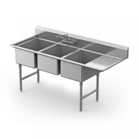 Sink, three compartment, with 18" right-hand drainboard, 28" front-to-back x 20" wide x 12" deep with backsplash, stainless steel legs & adjustable feet, 16/304 stainless steel, NSF