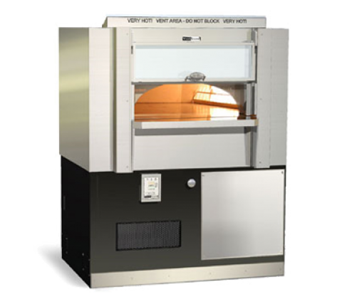 Fire Deck Stone Hearth Oven, radiant burner on right side of chamber with infrared under floor burner, includes standard stainless mantel, 40" w x 34" d hearth, (16) 8", (10) 10", (6) 12" or (4) 16" pizza capacity, monolithic cast-ceramic floor & dome create "deep heat sink", lift-up glass heat shield door, stainless steel front upper, stainless steel service panel, heavy duty steel frame base painted black, ETL-Sanitation, 160,000 BTU