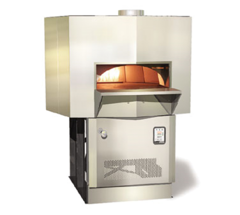 Mt. Adams Stone Hearth Oven, radiant gas flame in dome and infrared burner under hearth, 52" diameter hearth, (16) 8", (12) 10", (8) 12" or (5) 16" pizza capacity, monolithic cast-ceramic floor and dome create "deep heat sink", angle iron stand, 10" OD flue collar, 188,000 BTU, cETLus, ETL-Sanitation