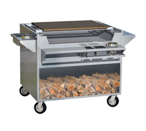 Mt. Saint Helens, Shallow-Box Charbroiler, 34" w x 36"d, (5) 6" x 24" cast iron grates on sliding stainless steel frame, "heat-sink" style fire box cast from dense high-temperature ceramic, insulated, includes (1) grate tool, (1) particle shovel & (1) T-style floor brush 40", stainless steel exterior, stainless steel wood storage cabinet base, casters set of 4 (2 locking 2 non locking), cETL