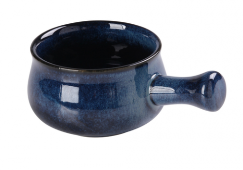 Skillet Bowl, 22 oz., 5" dia., round , 3-1/8" deep, with handle(2-1/2"L), color glazed porcelain, microwave & dishwasher safe, blue (sold by case)