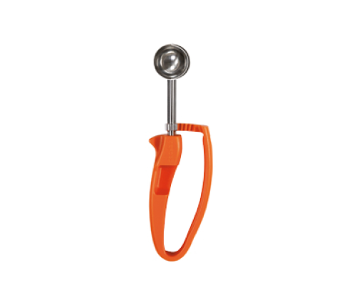 Zeroll® Universal EZ Disher, size 100, 1-3/16" bowl diameter, right or left handed use, ergonomic design, orange color coded handle, no springs, stainless steel bowl and scraper blade, NSF approved for commercial use